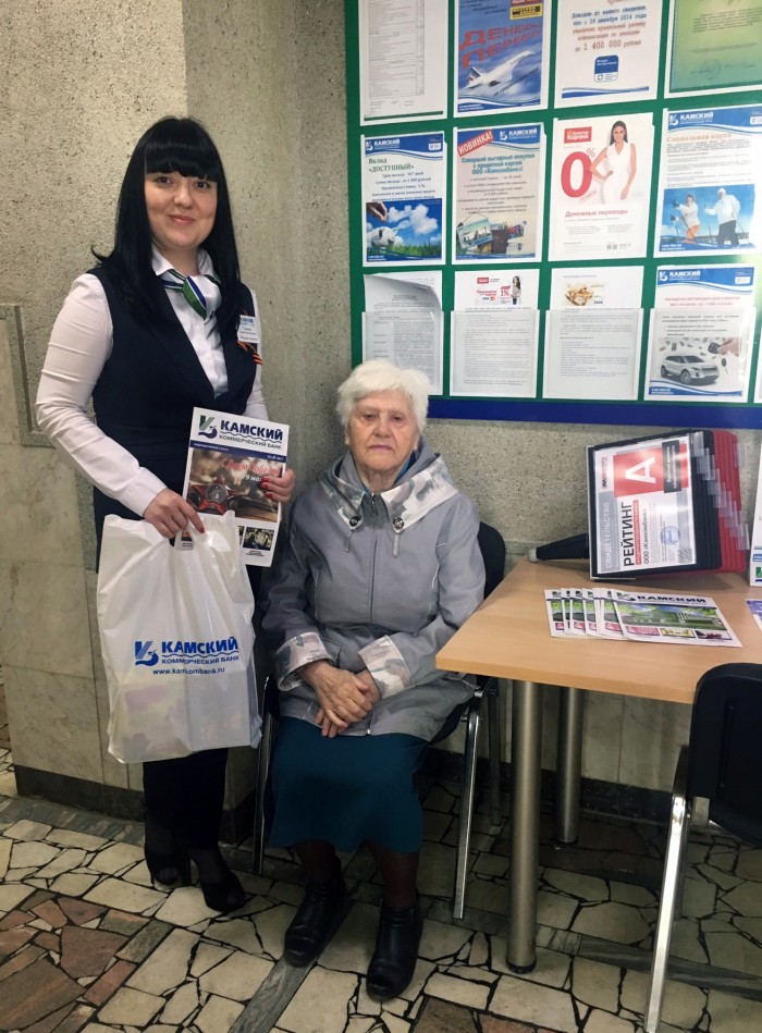 По доброй традиции Камский коммерческий банк поздравляет вкладчиков-ветеранов Великой Отечественной Войны с праздником и вручает им подарки во всех офисах банка.