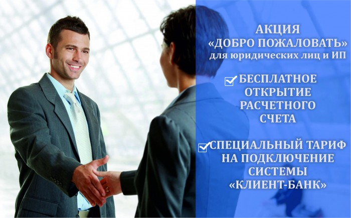Акция «Добро пожаловать» (далее – Акция) предполагает бесплатное открытие расчетного счета и скидку на подключение к системе «Клиент-банк», при условии подачи Клиентом документов для открытия расчетного счета в рублях в период действия Акции.