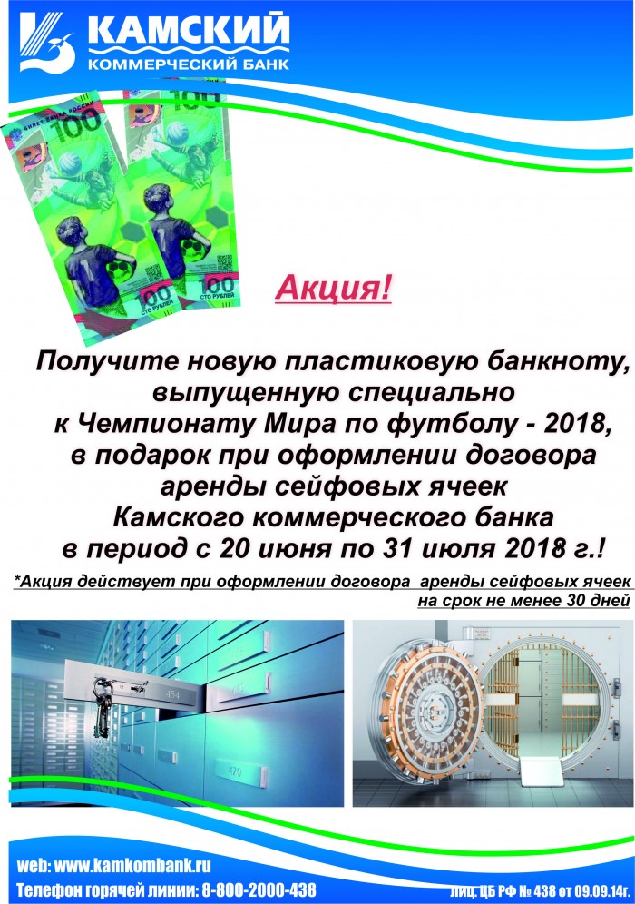Получите новую банкноту, выпущенную специально к Чемпионату Мира по футболу - 2018, в подарок при оформлении договора аренды сейфовых ячеек Камского коммерческого банка.*