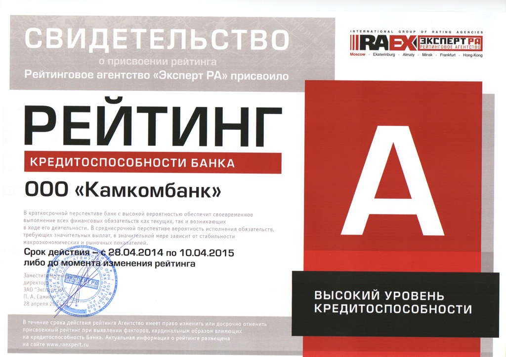 Рейтинговое агентство «Эксперт РА» в очередной раз подтвердило рейтинг кредитоспособности Камского коммерческого банка на уровне А «Высокий уровень кредитоспособности», прогноз «стабильный».