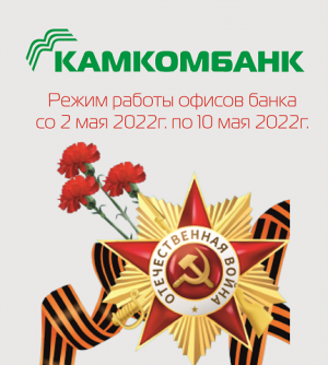 Режим работы офисов банка со 2 мая 2022г. по 10 мая 2022г.