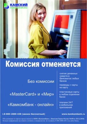 Снять наличные средства с карты Камского коммерческого банка можно в ЛЮБОМ банкомате без комиссии