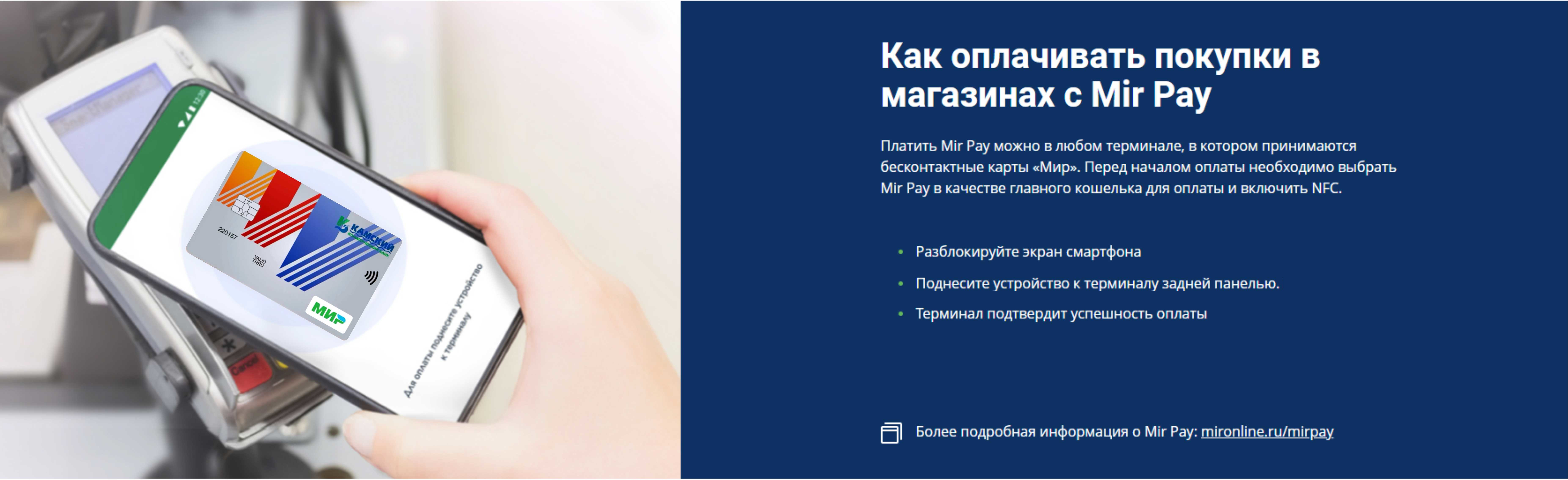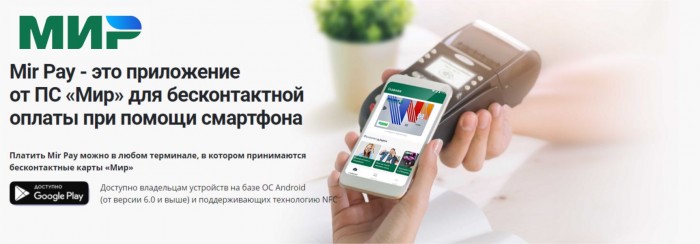 Mir Pay – это удобный и безопасный сервис бесконтактных платежей, для пользования которым достаточно установить приложение и пройти простую процедуру регистрации Вашей карты «Мир», для оплаты просто поднесите смартфон к терминалу: деньги за покупки будут списываться с Вашей банковской карты.